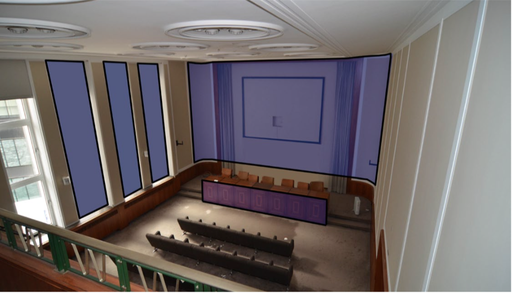 An den Saal zeigt 19 Arbeiten, die sich im „Plenarsaal“ des ehemaligen Vorstandsgebäudes der Deutschen Bank einnisten. Als Gruppe Site Specific Film 2017 haben wir in diesem Raum gepicknickt, ihn vermessen, ihm zugehört und zu bespielende Flächen in ihm ausgemacht. Mit dem getäfelten Vorstandspult und den sakralbau-artigen Fensterproportionen bietet der Ort großartige Ausgangsbedingungen für unsere Projektionen. An den Saal reflektiert Themen zwischen Herrschaft und Desire.