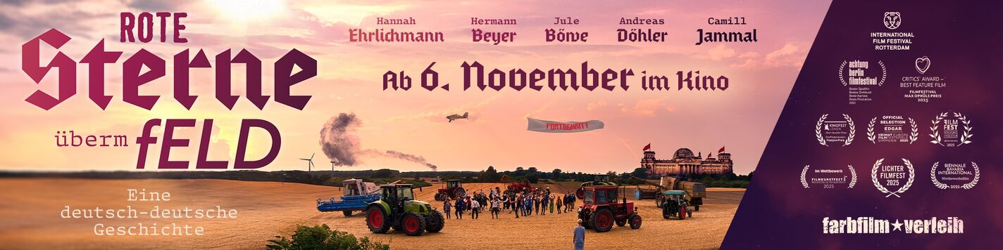 ROTE STERNE ÜBERM FELD ist eine Regiearbeit von Filmuni-Alumna Laura Laabs, die auch für das Drehbuch verantwortlich zeichnet. Ihre ehemalige Kommilitonin Emma Gräf (Studiengang Montage) hat den Film geschnitten und Till Aldinger (Studiengang Sound) die komplette Tongestaltung verantwortet. Seine Weltpremiere feiert der Film auf dem Filmfestival Max Ophüls Preis 2025, die Internationale Premiere folgt beim Internationalen Filmfestival Rotterdam (IFFR).